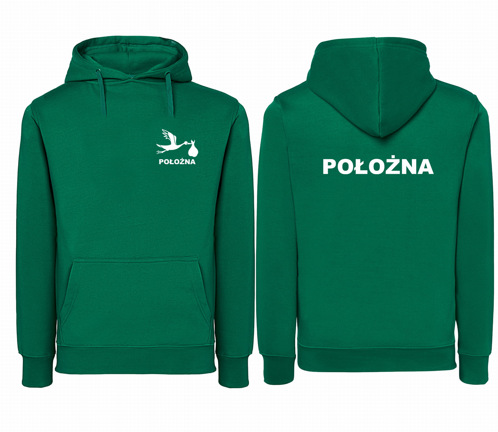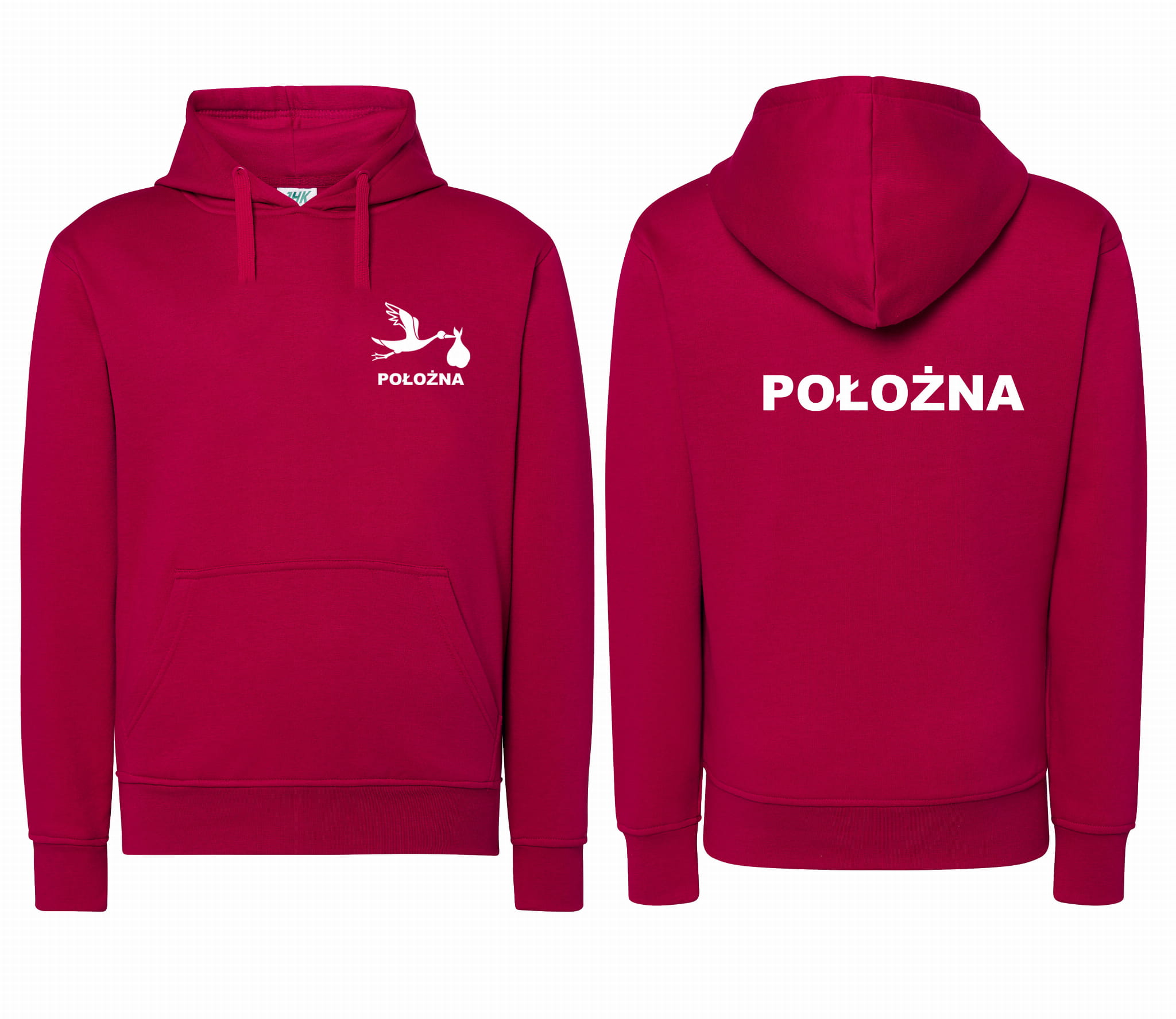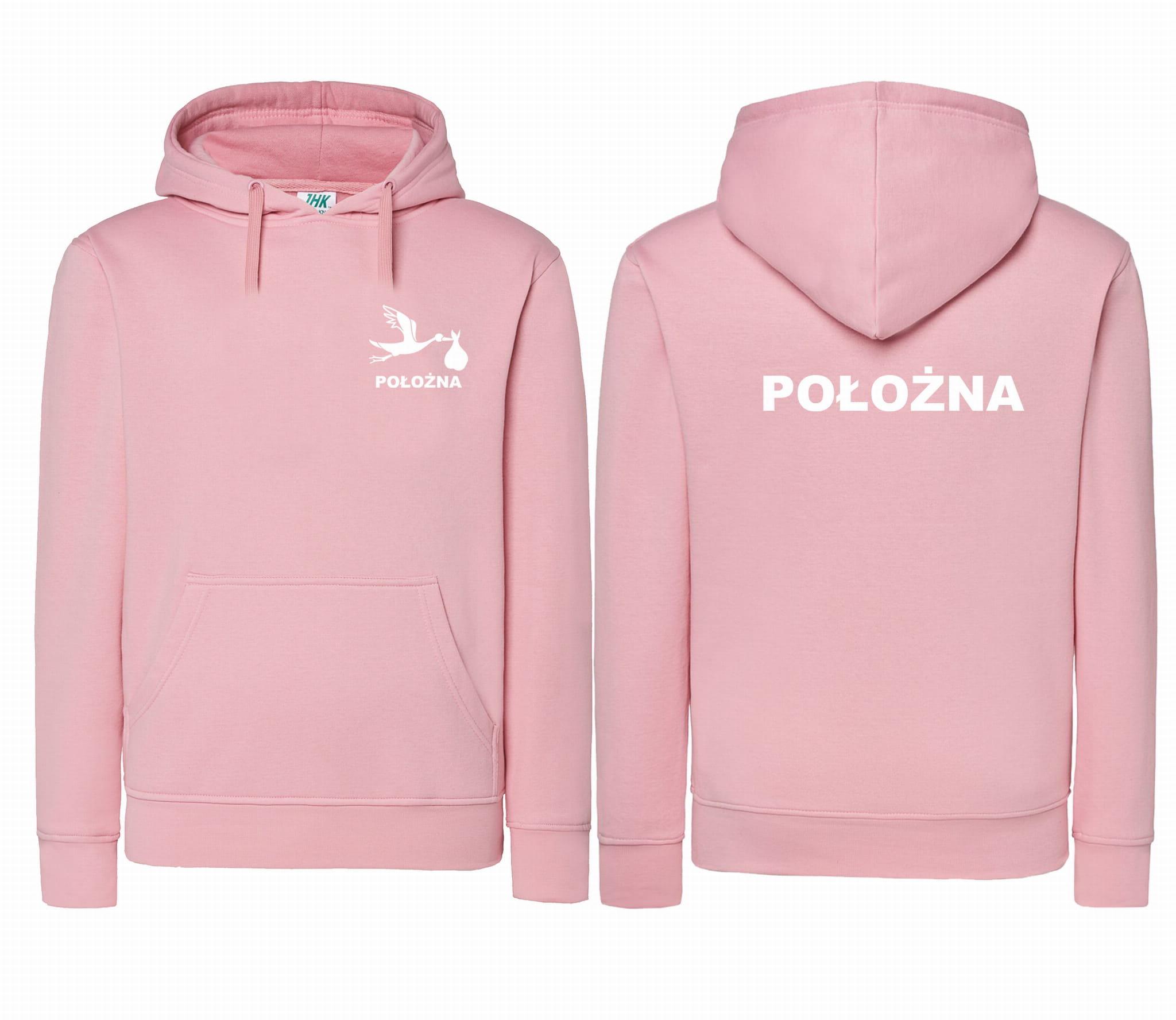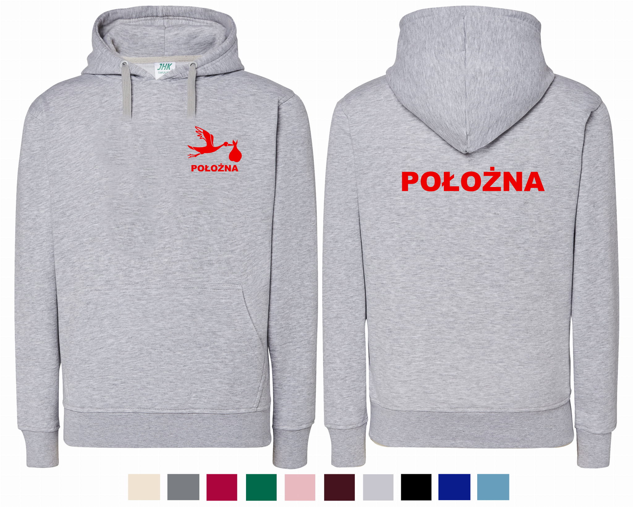 Bluza damska z kapturem kangurka JHK POŁOŻNA BOCIAN nadruk PRZÓD i TYŁ