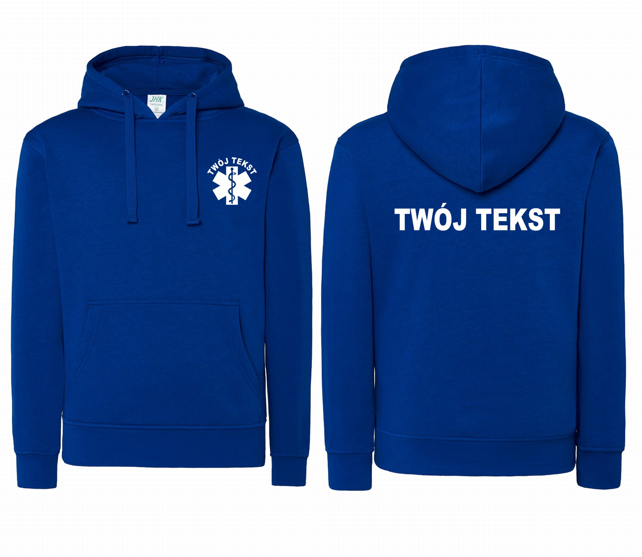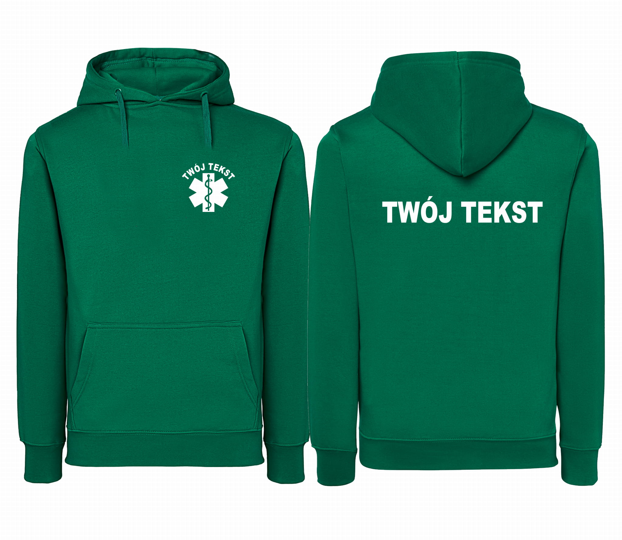Bluza damska z kapturem kangurka TWÓJ TEKST + ESKULAP nadruk PRZÓD i TYŁ JKH