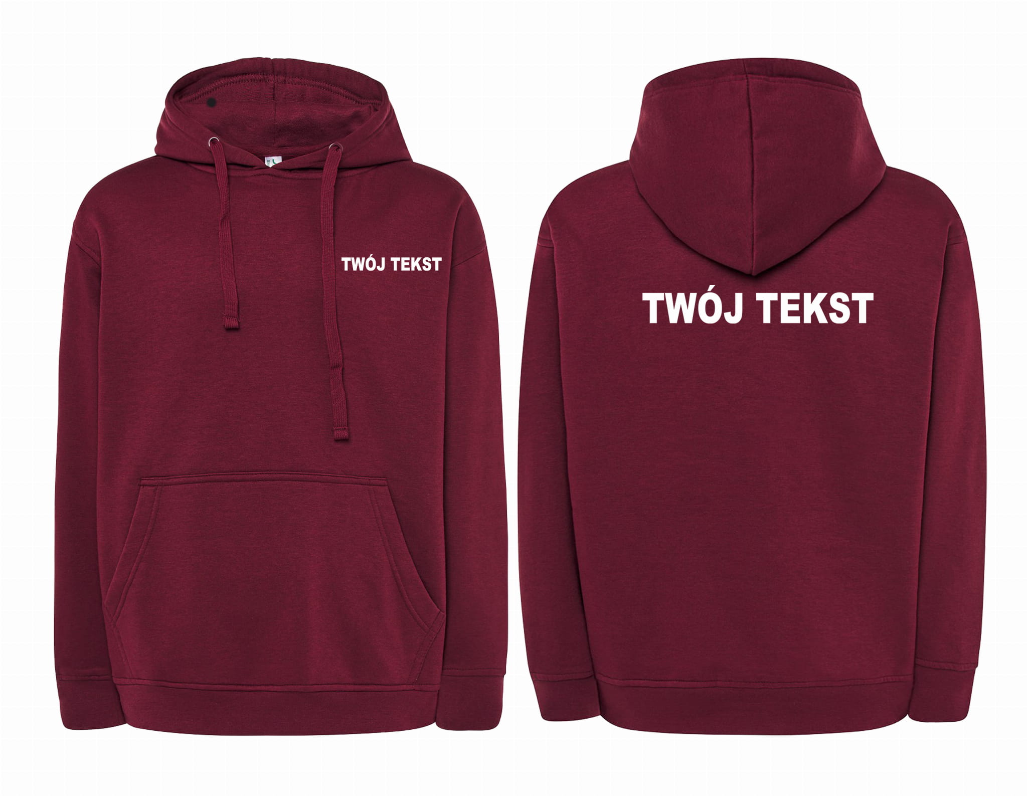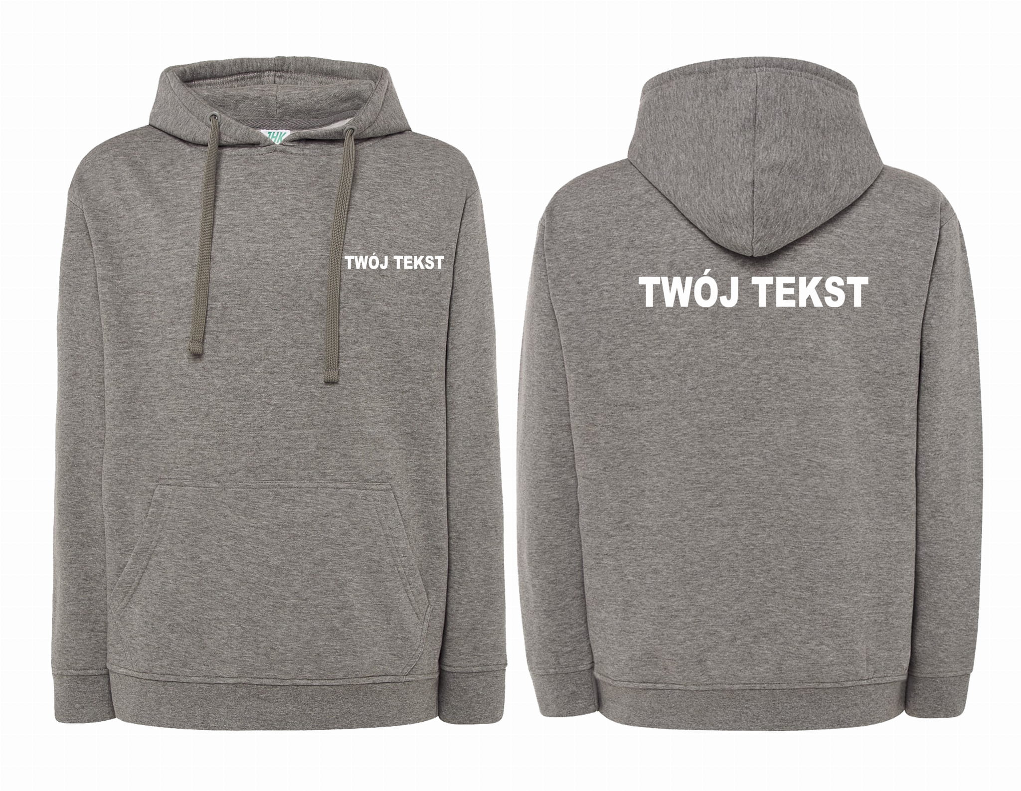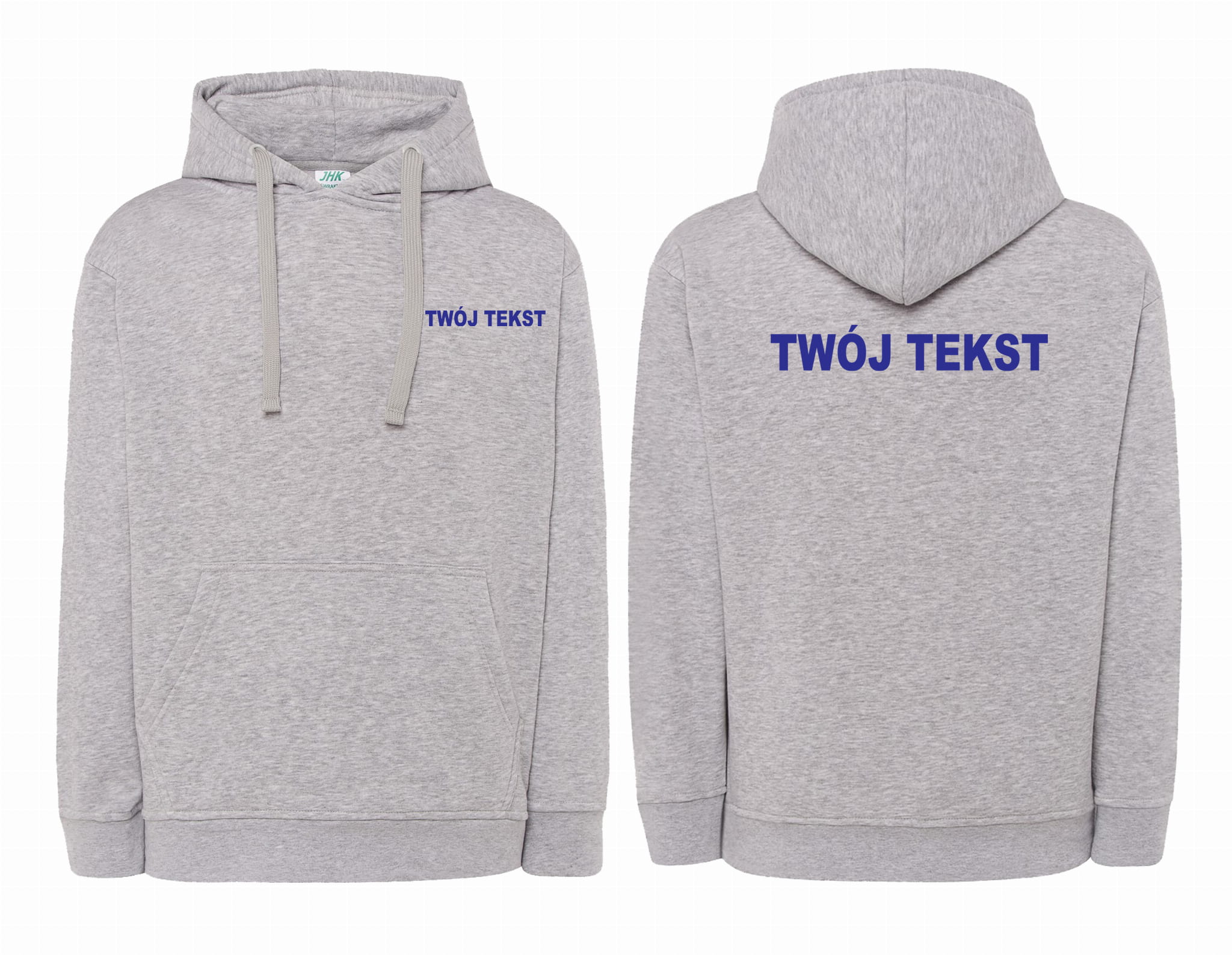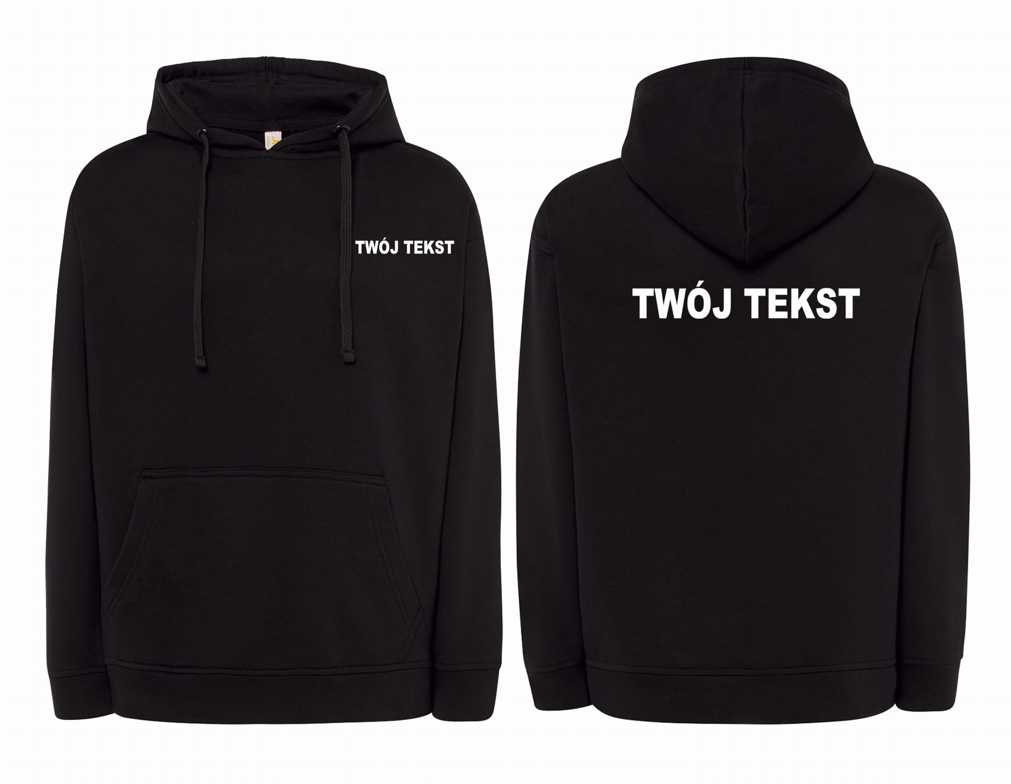 - znakowanie wykonane folią flex Z PRZODU I Z TYŁU BLUZY (tekst umieszczamy w 1-3 linijkach, im dłuższy tekst tym mniejsza czcionka)
