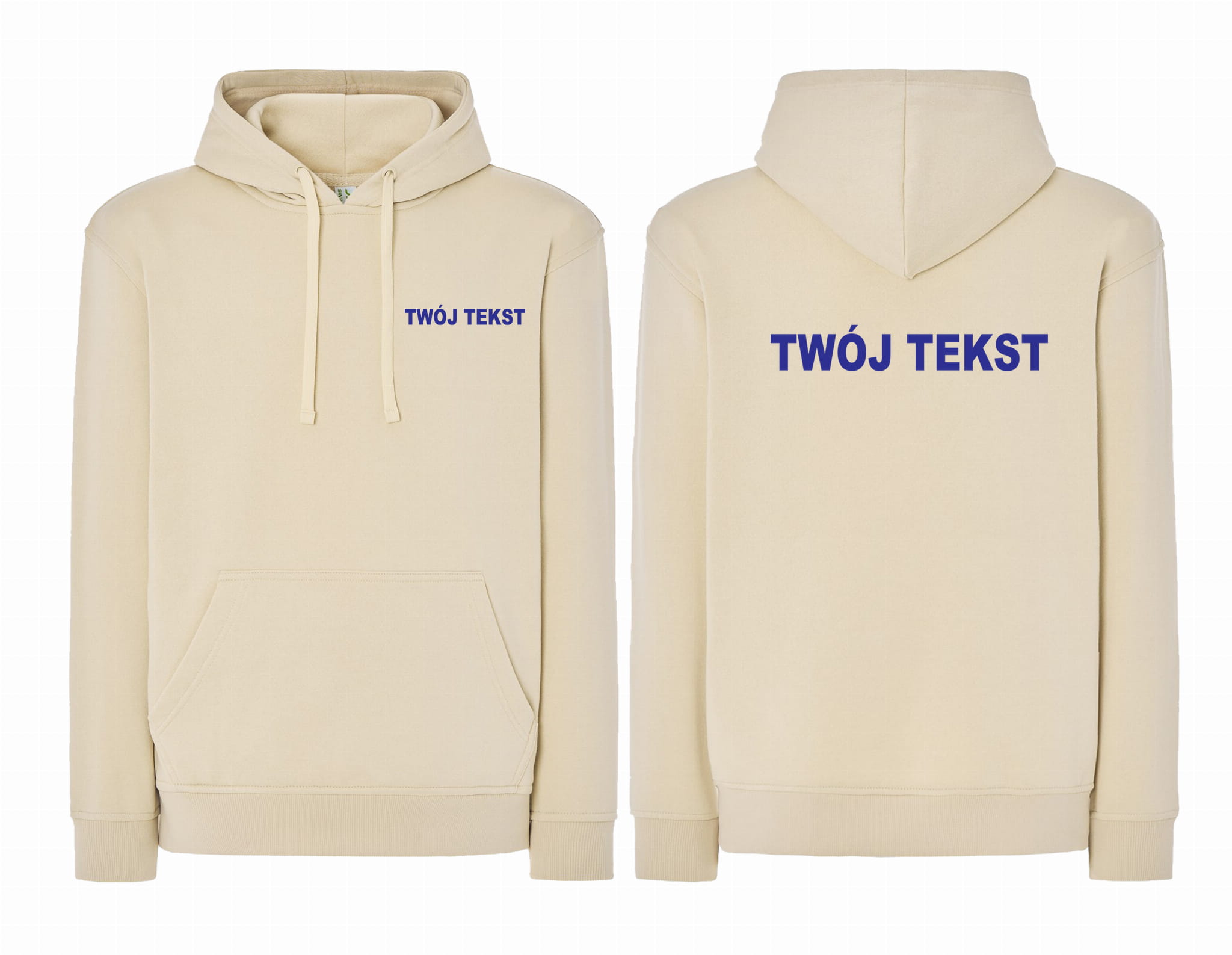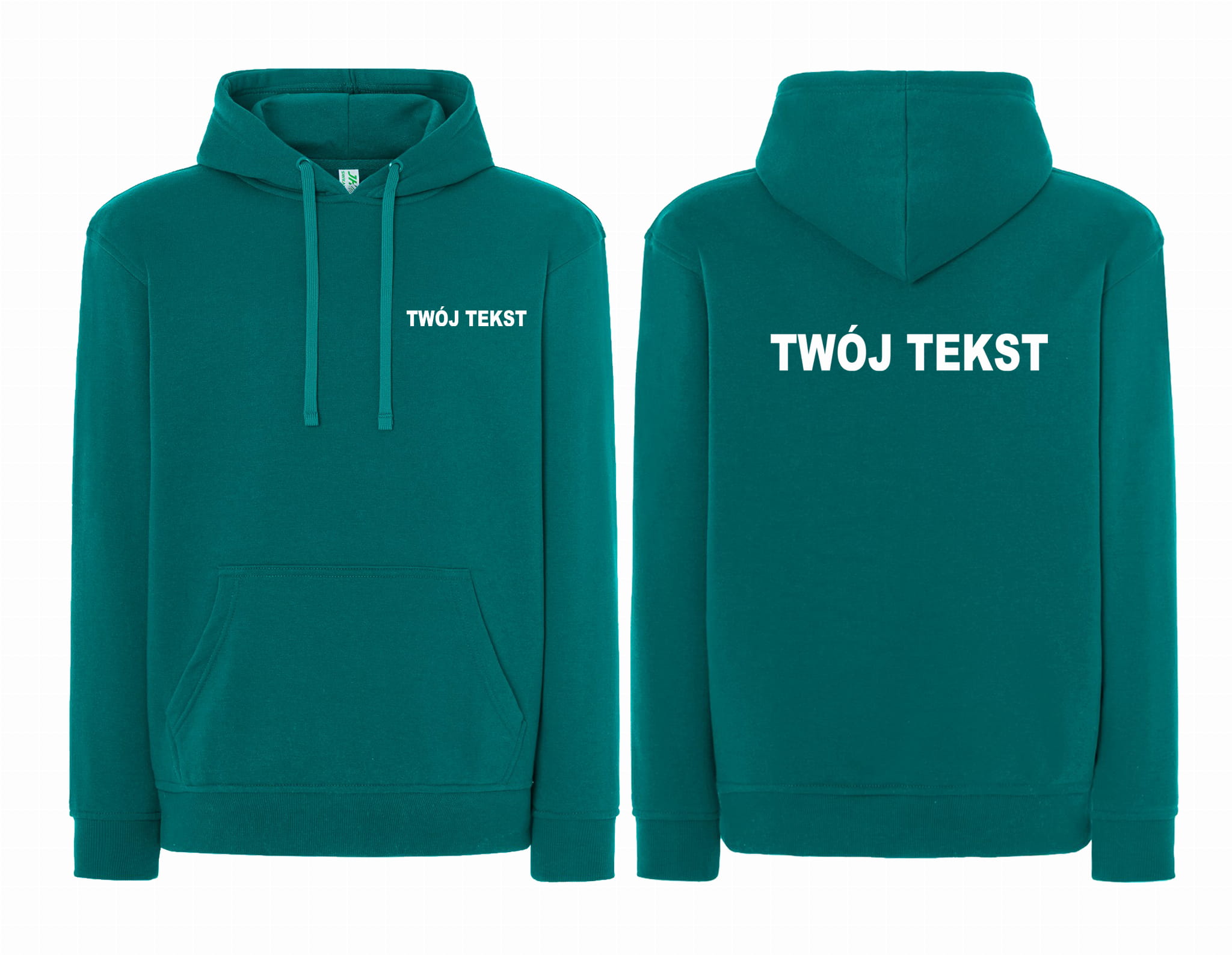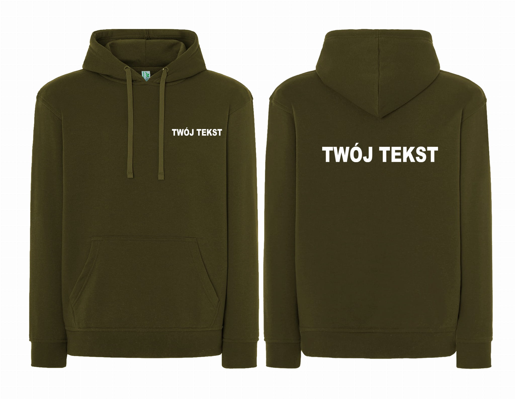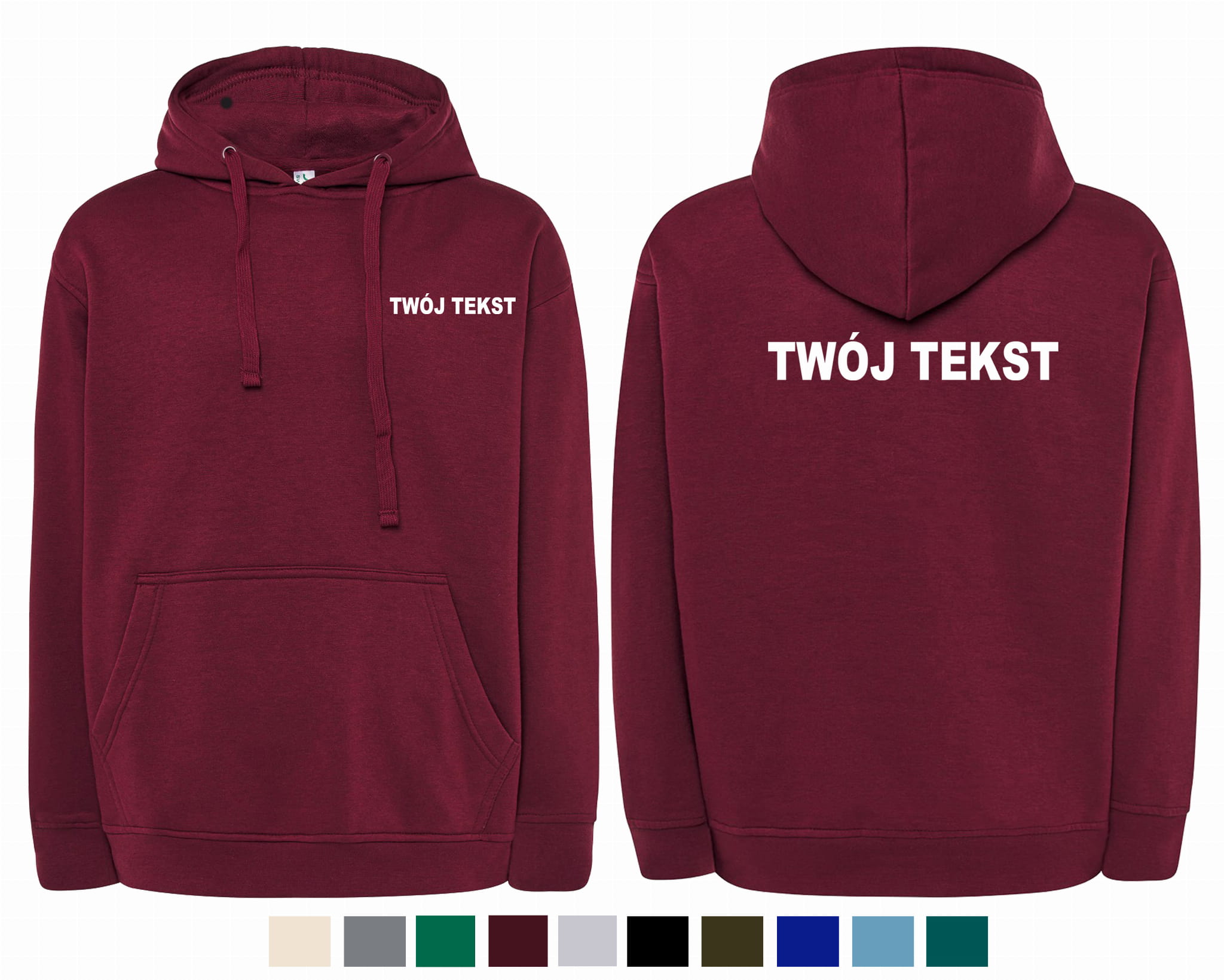 - znakowanie wykonane folią flex Z PRZODU I Z TYŁU BLUZY (tekst umieszczamy w 1-3 linijkach, im dłuższy tekst tym mniejsza czcionka)