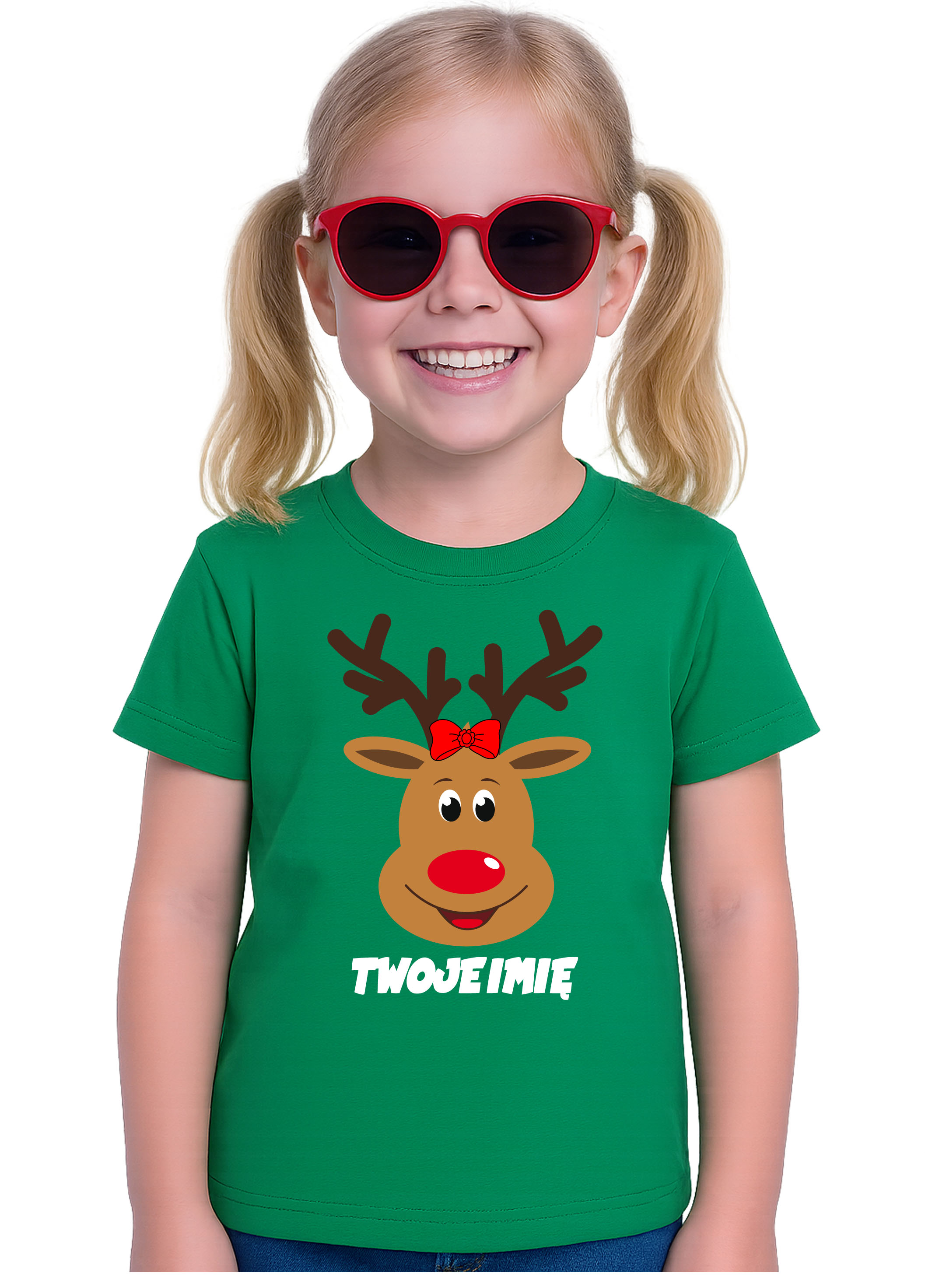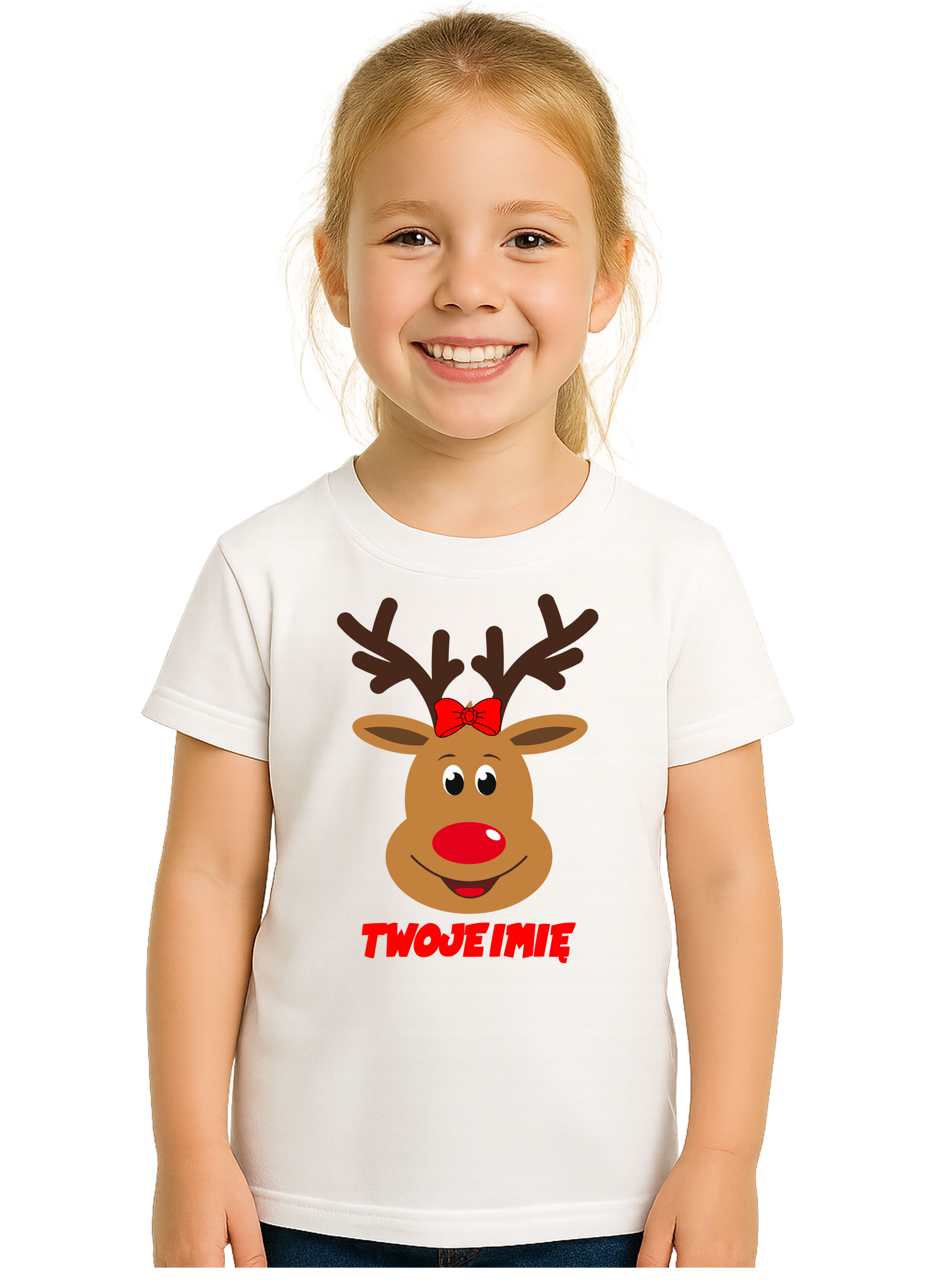 Koszulka JUNIOR świąteczna dla dziewczynki RENIFER + TWOJE IMIĘ