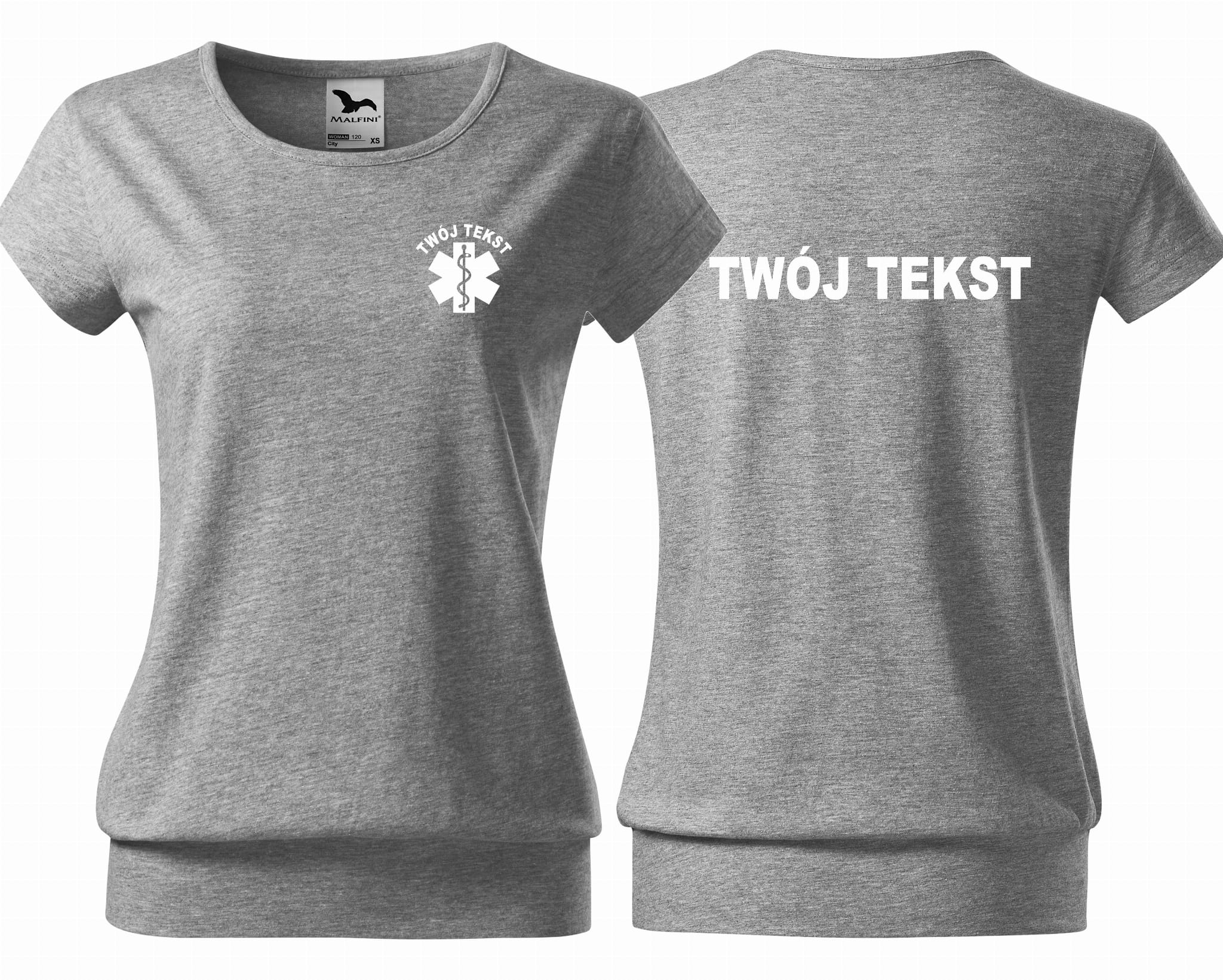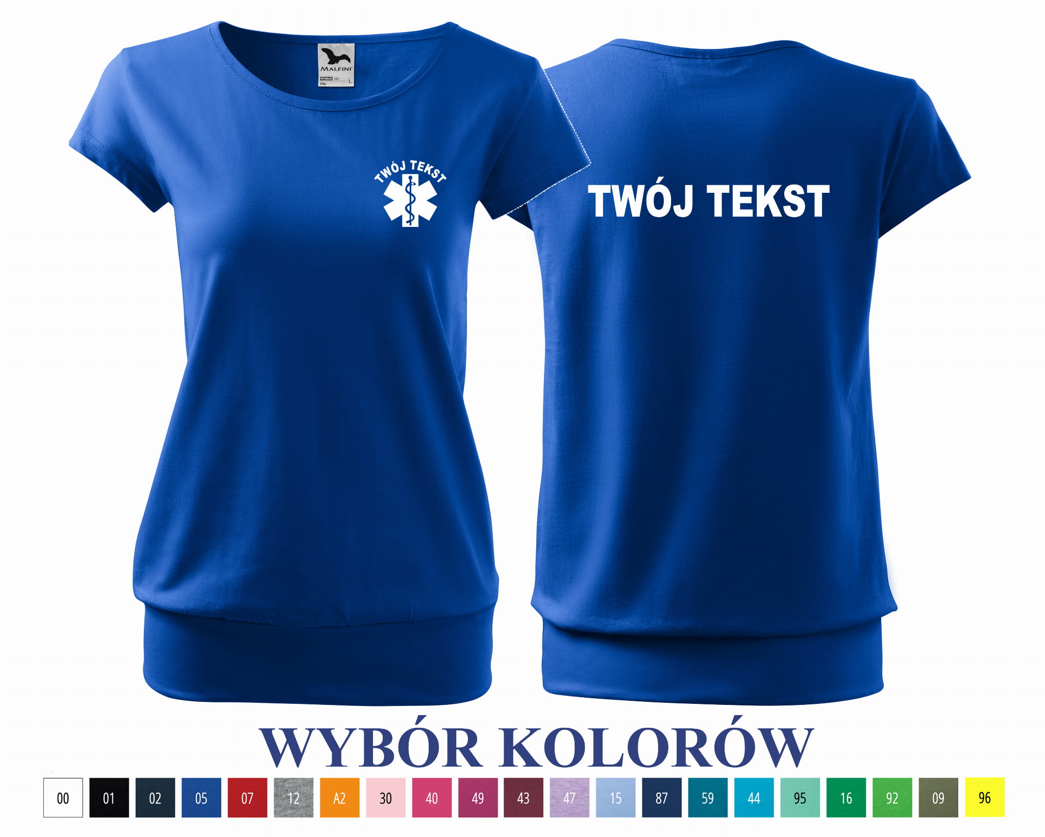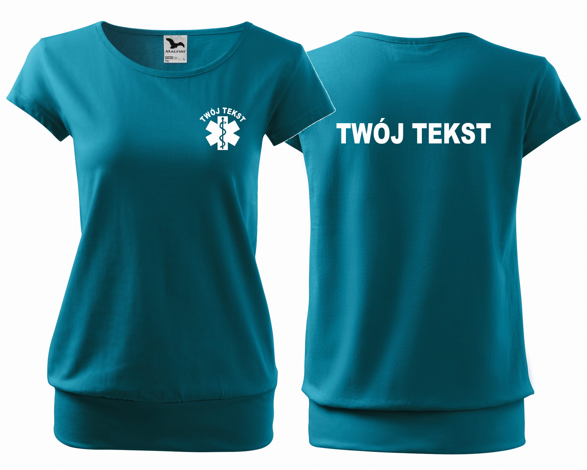 Koszulka damska CITY TWÓJ TEKST + ESKULAP nadruk PRZÓD I TYŁ
