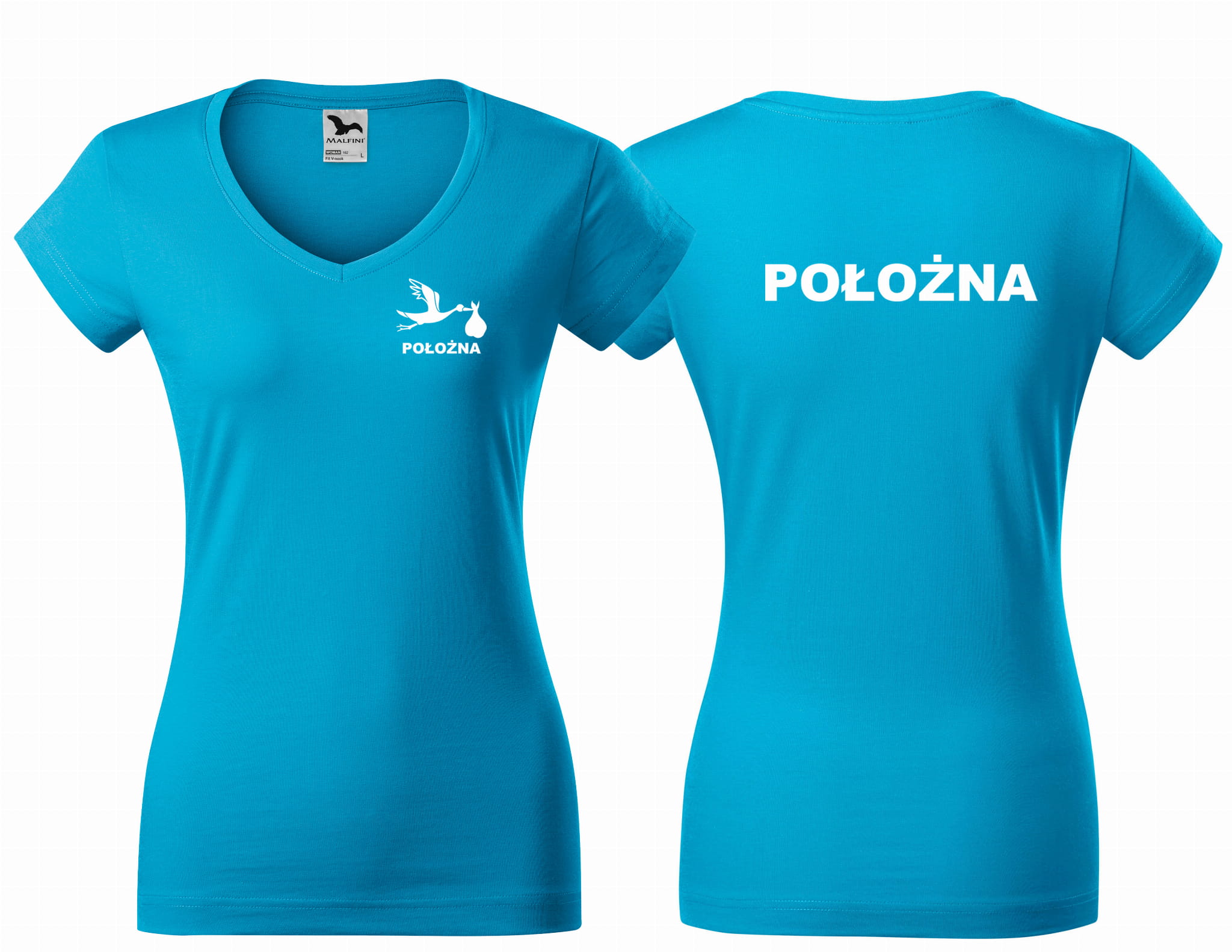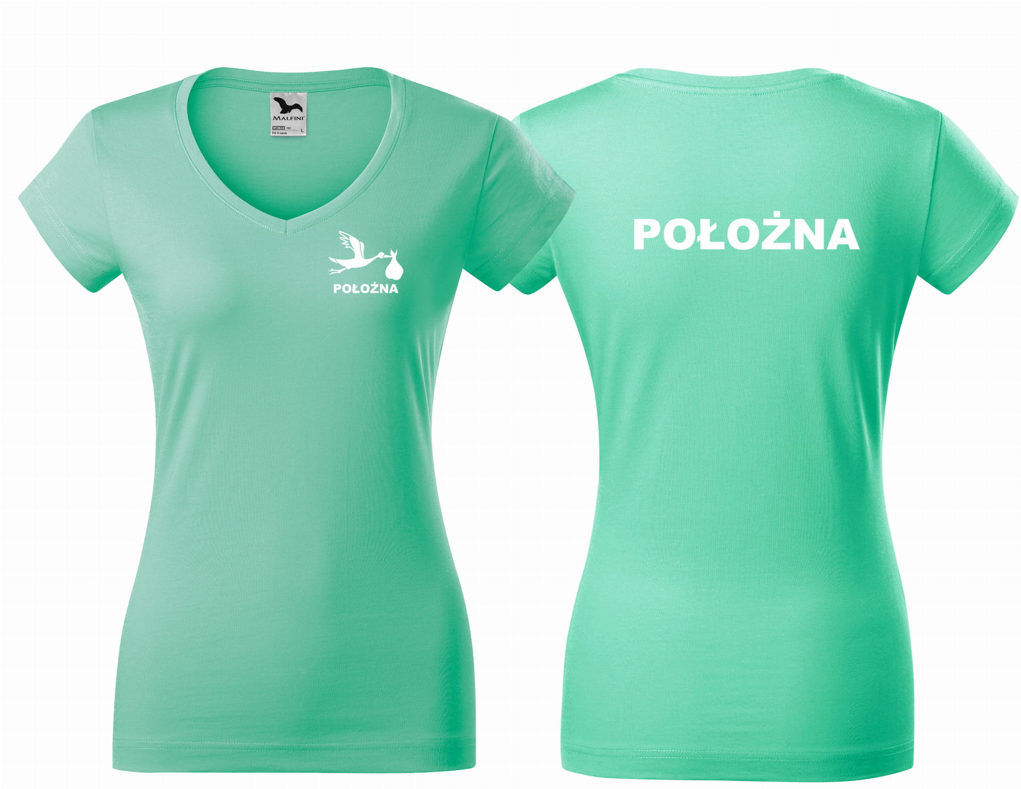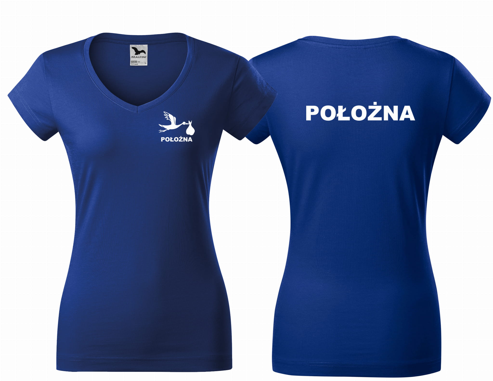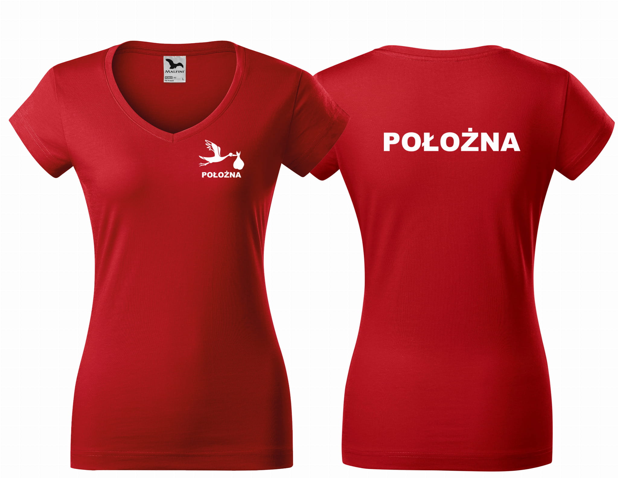 Koszulka damska V-NECK POŁOŻNA BOCIAN nadruk PRZÓD I TYŁ