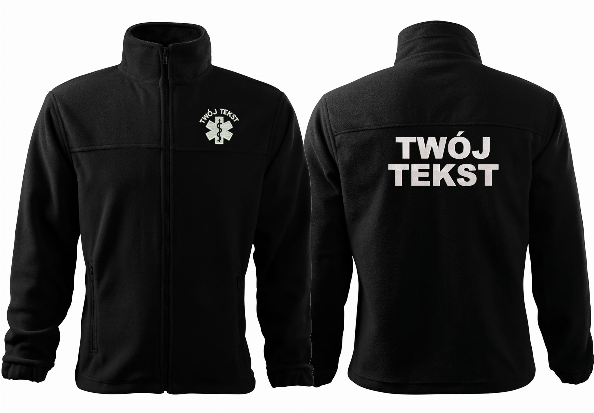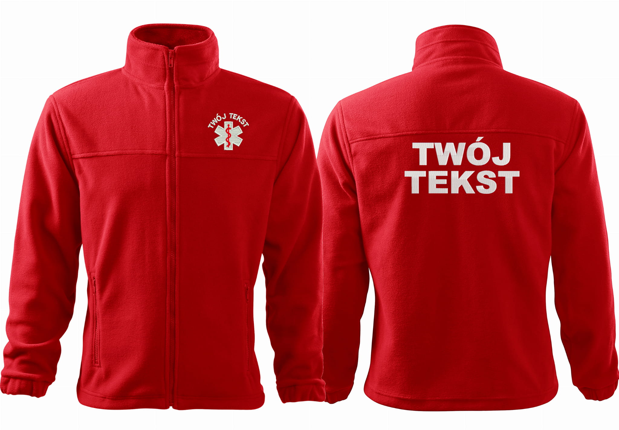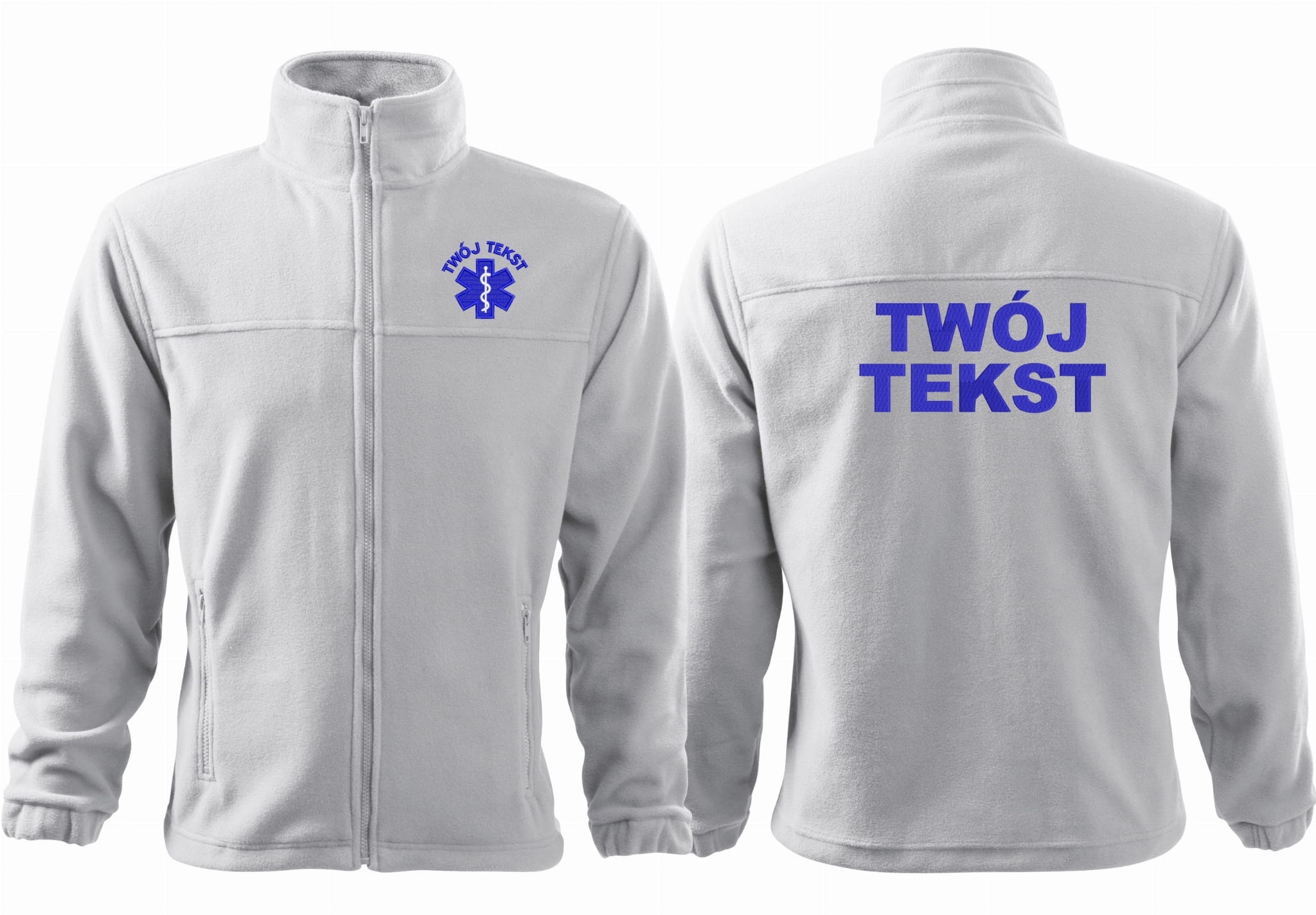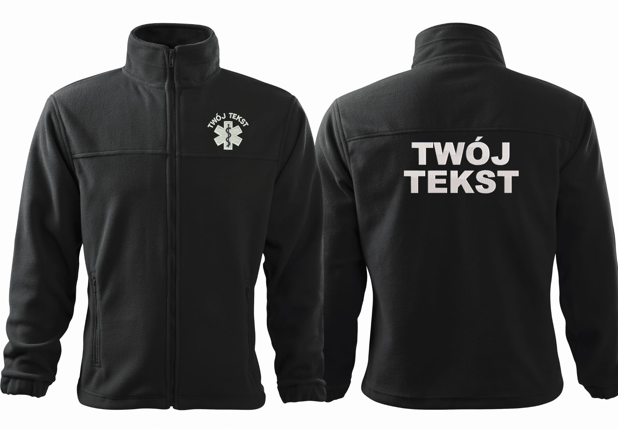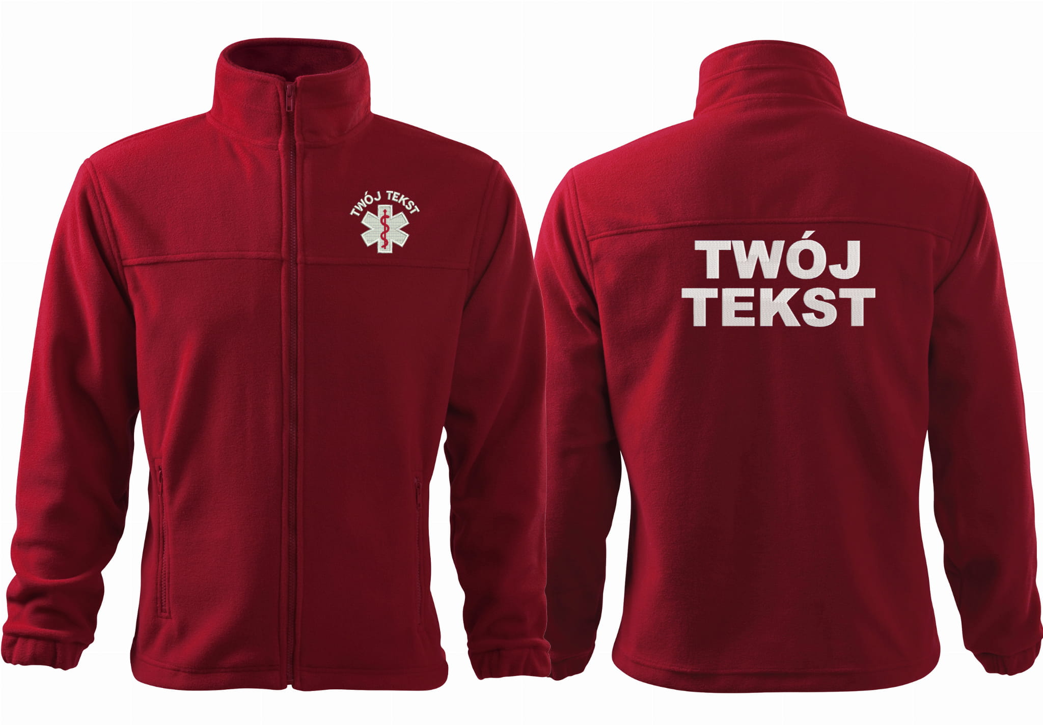 - trwałe znakowanie haftem komputerowy, przód polaru: tekst + znak medyczny, tył polaru: tekst (tekst umieszczamy w 1-3 linijkach, im dłuższy tekst tym mniejsza czcionka)