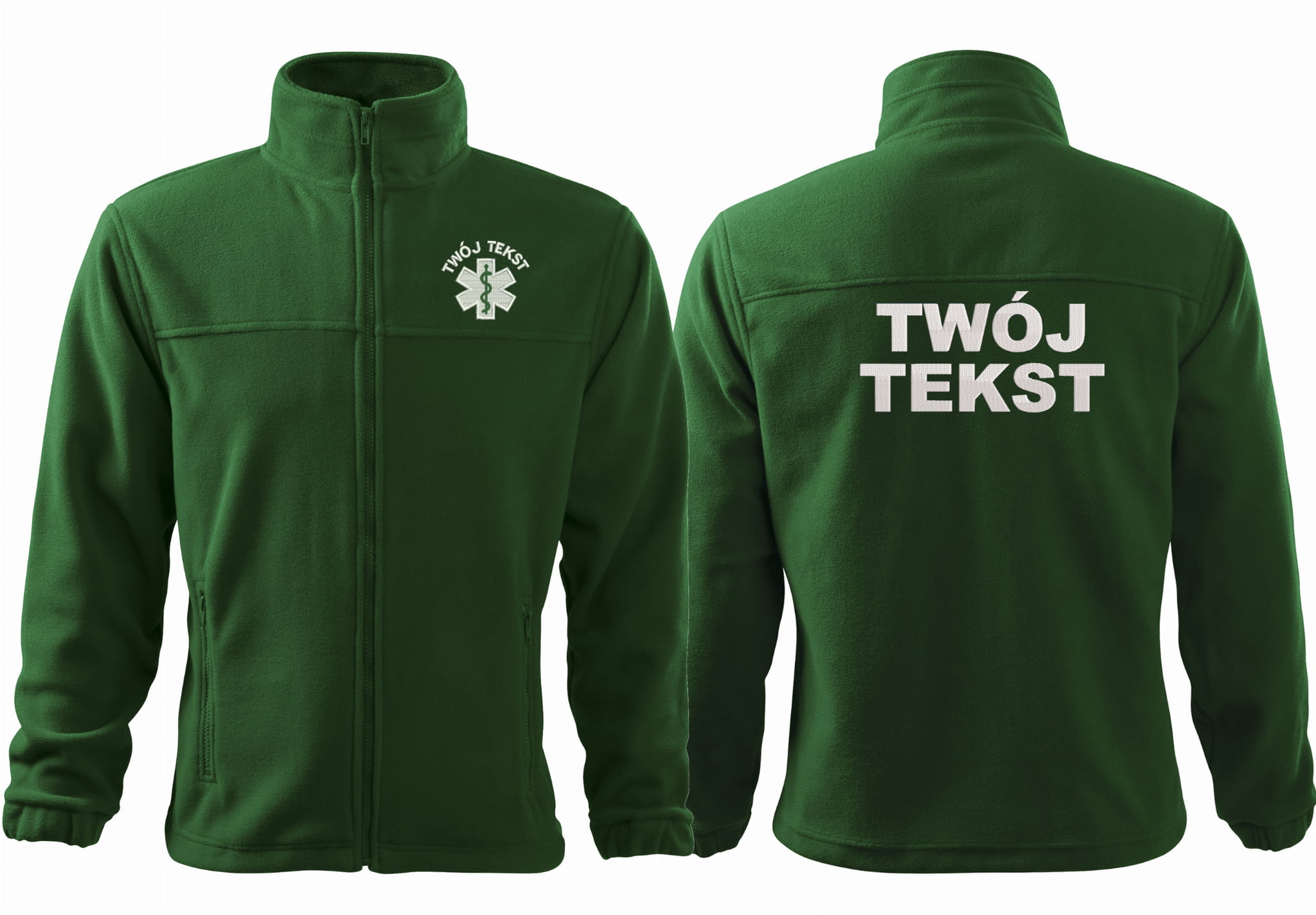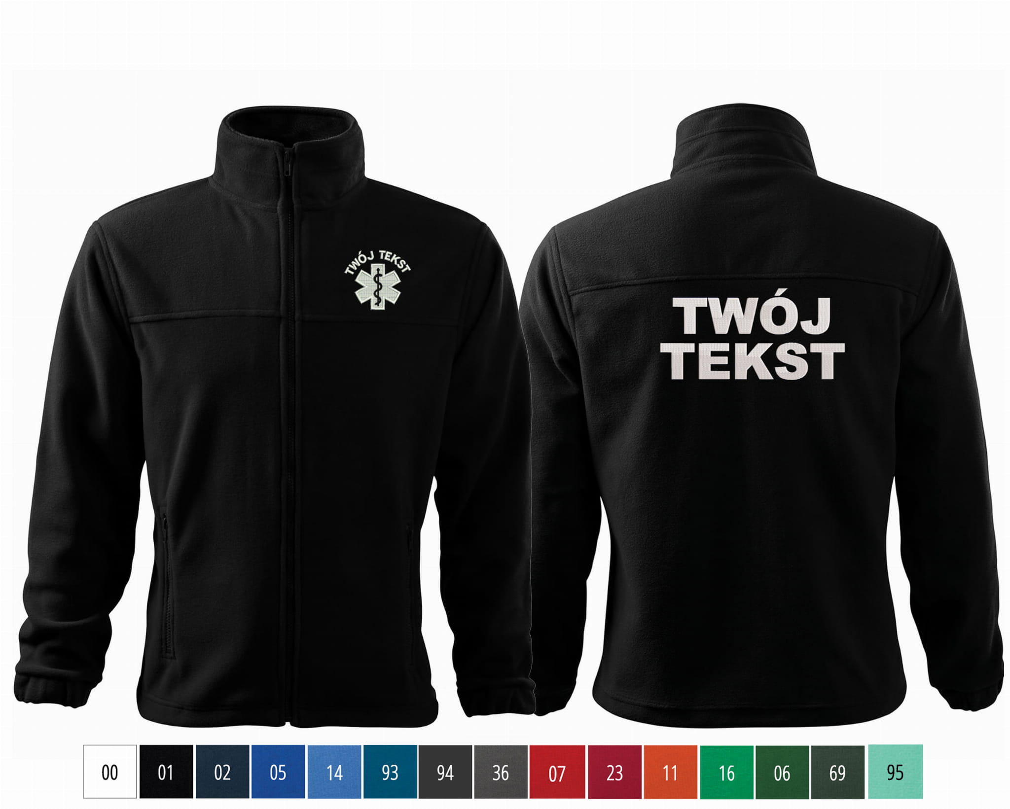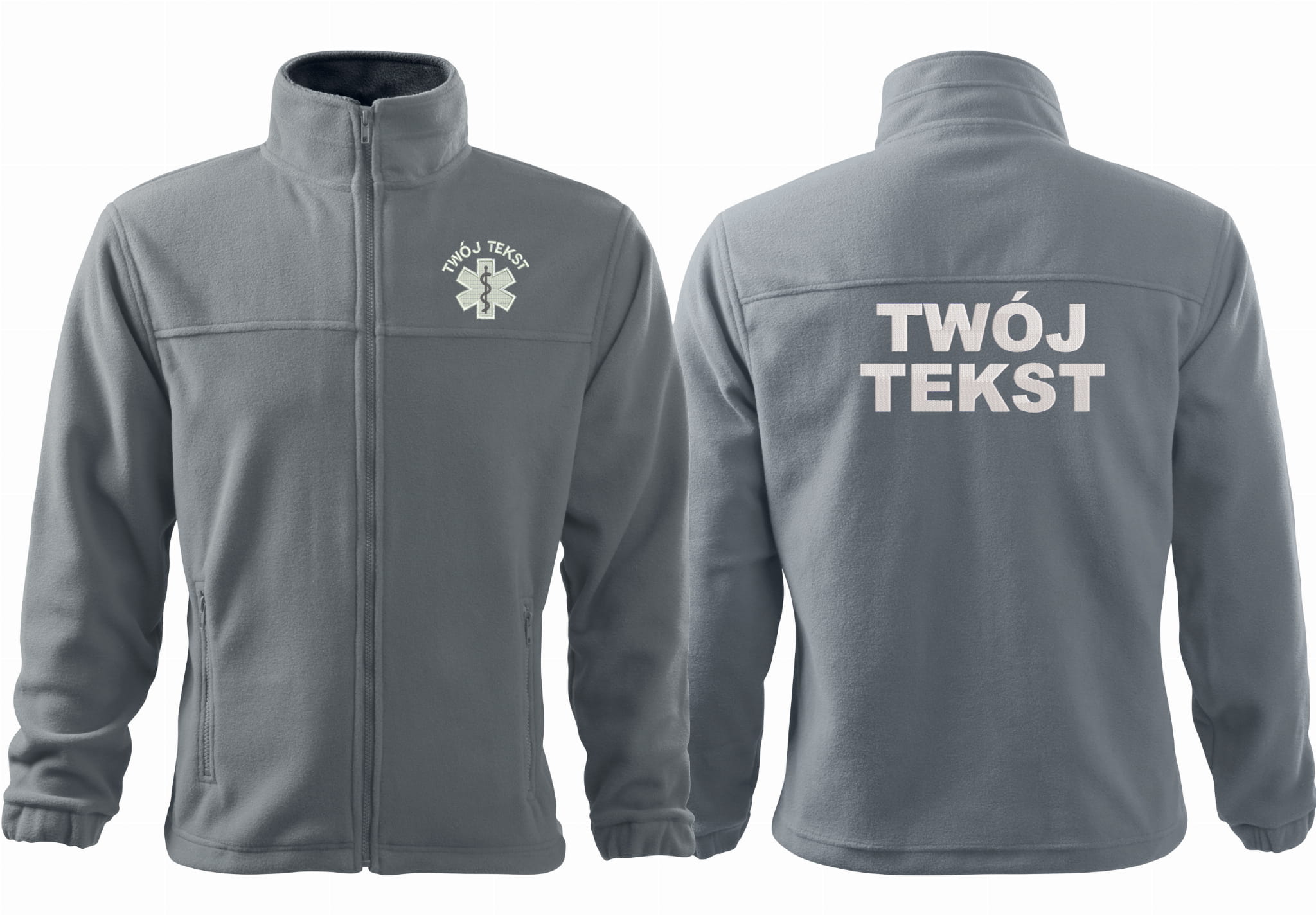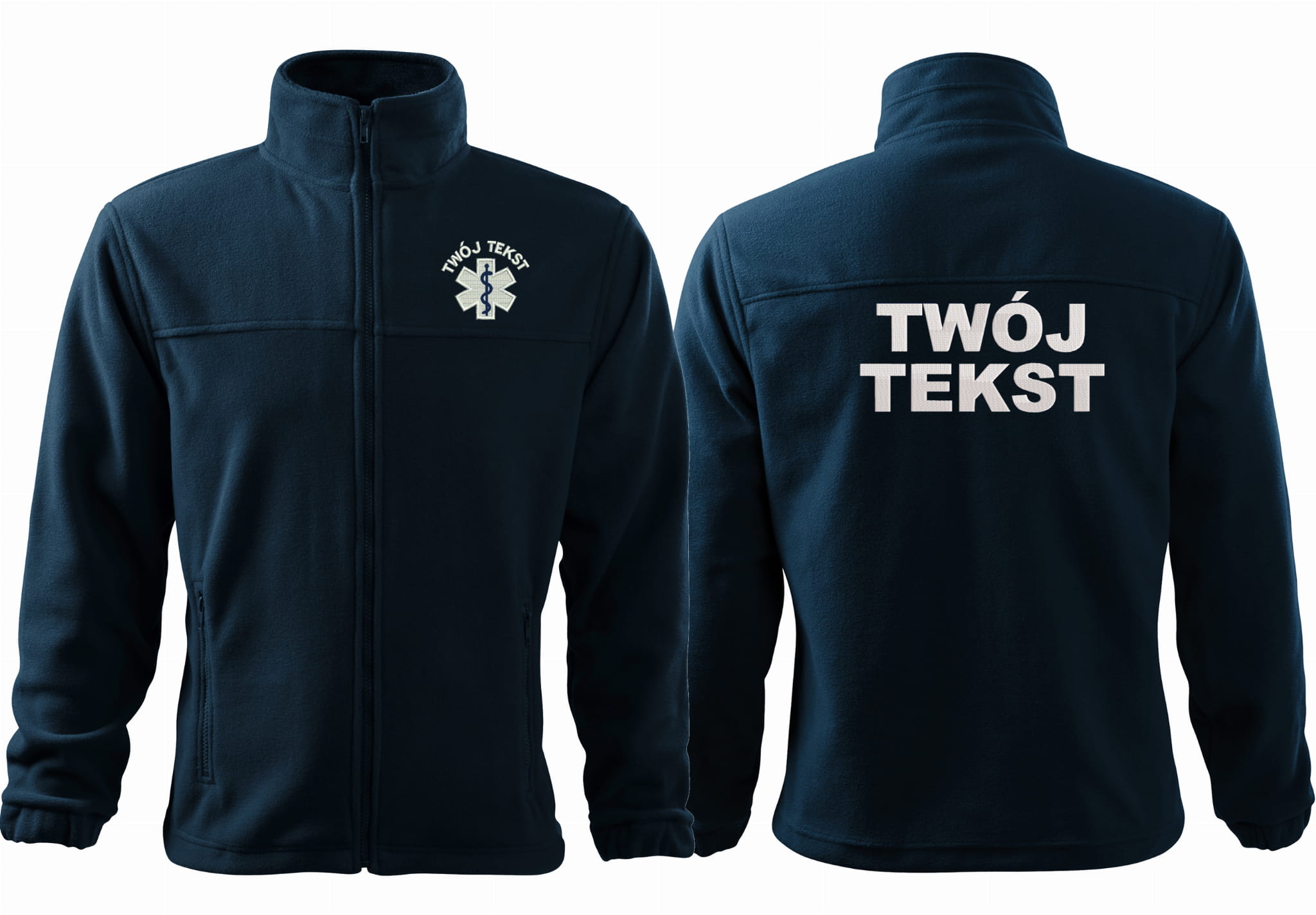 - trwałe znakowanie haftem komputerowy, przód polaru: tekst + znak medyczny, tył polaru: tekst (tekst umieszczamy w 1-3 linijkach, im dłuższy tekst tym mniejsza czcionka)