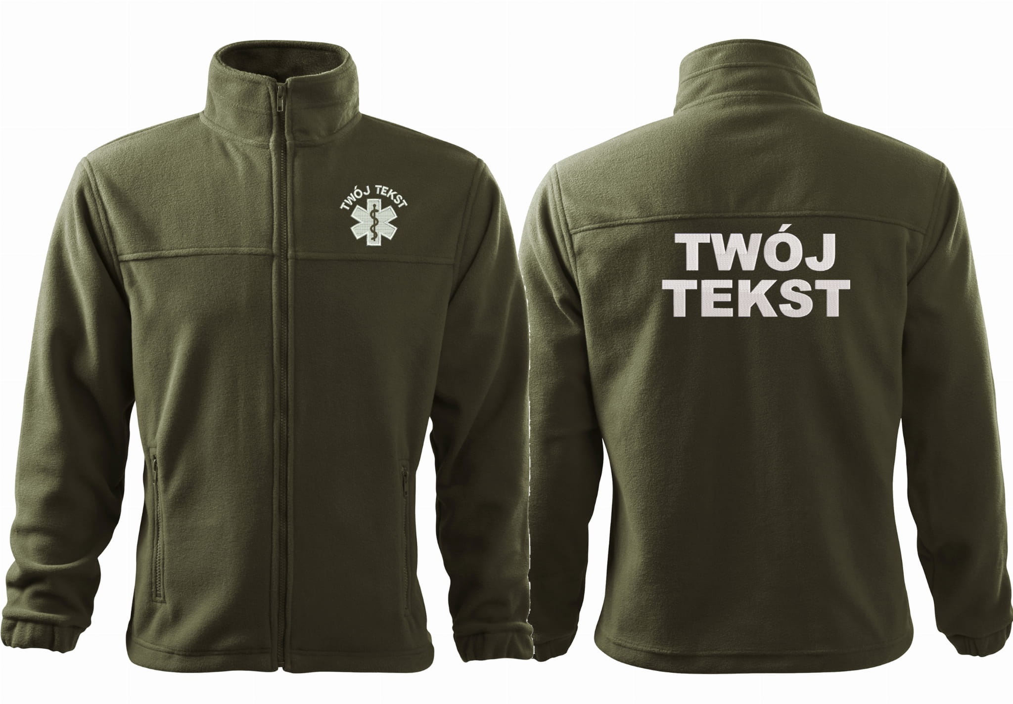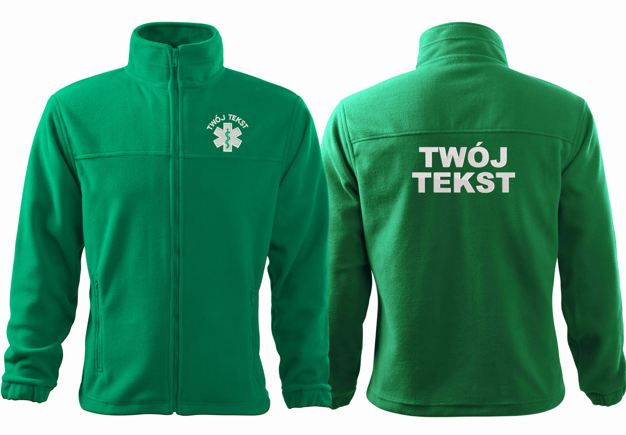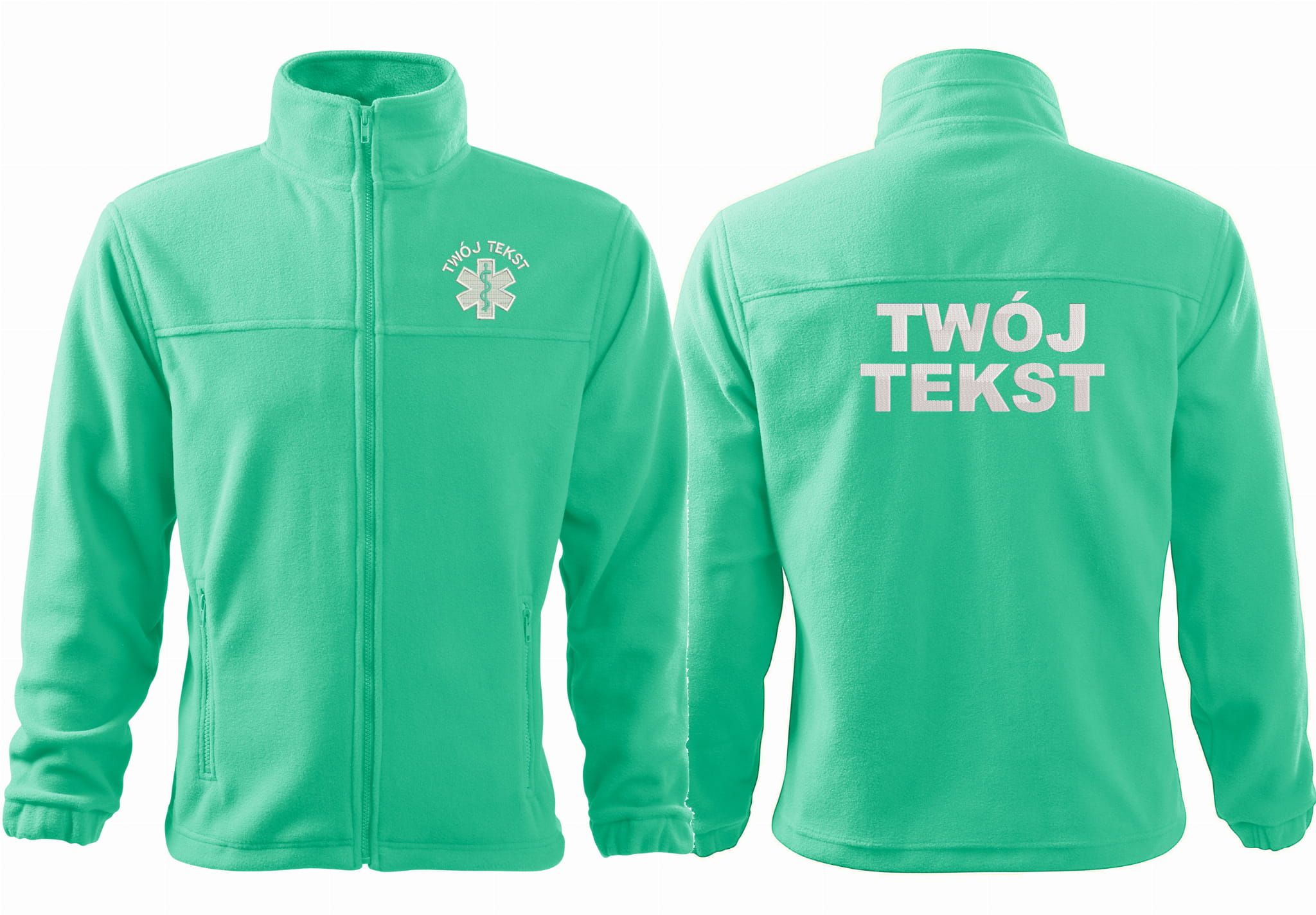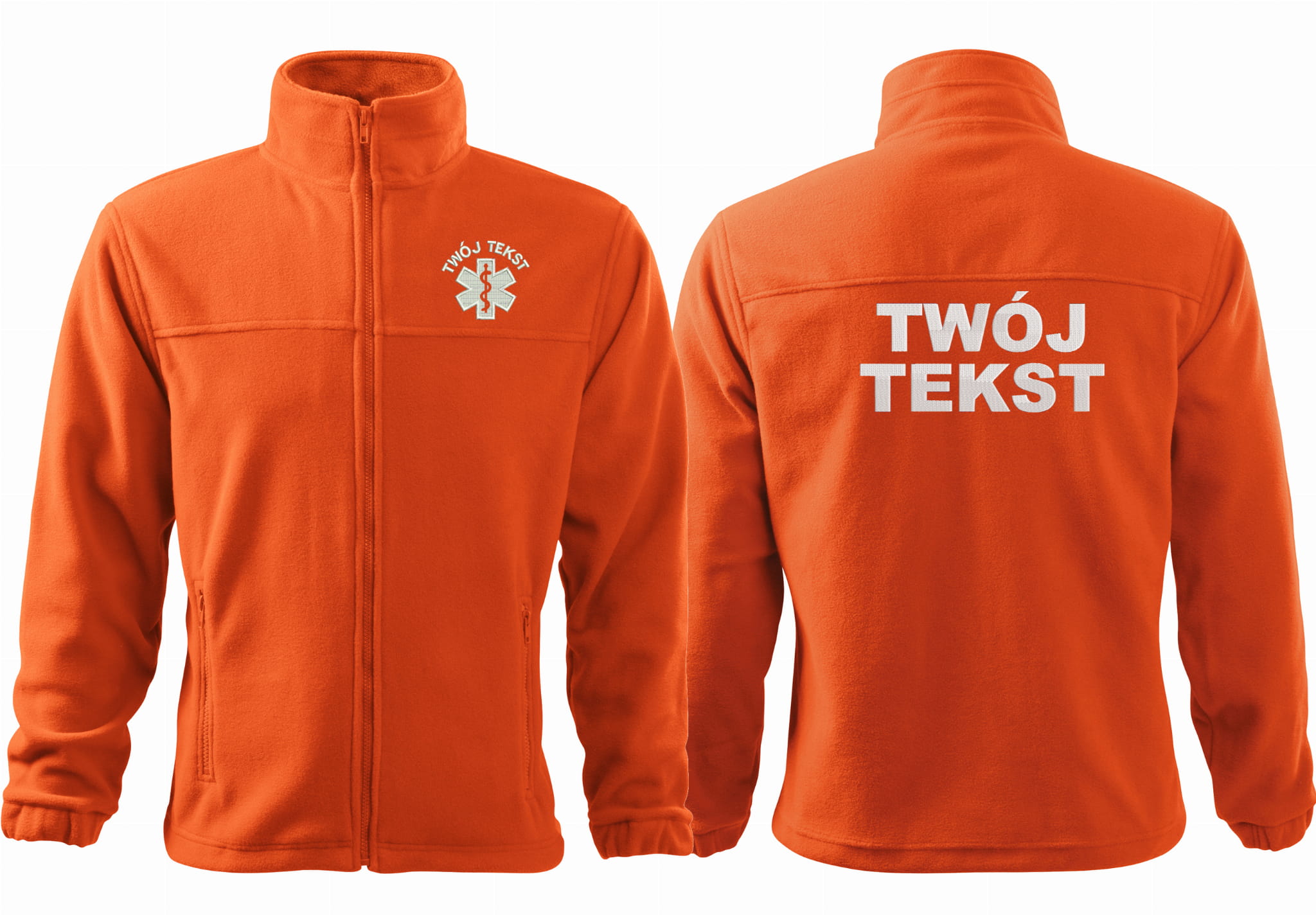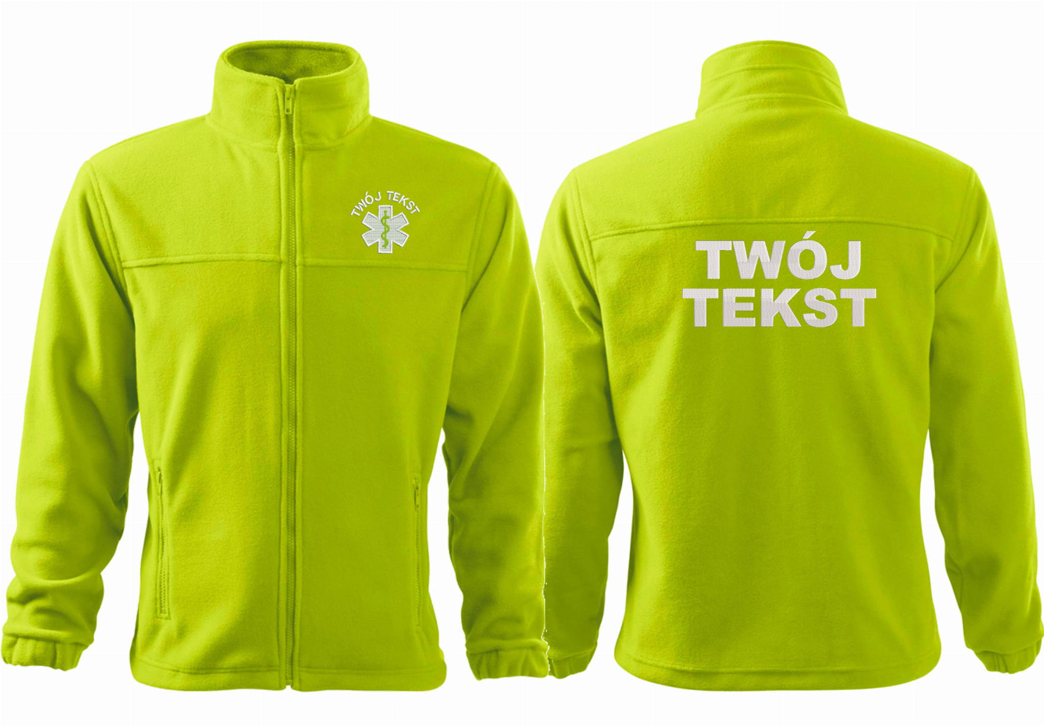 - trwałe znakowanie haftem komputerowy, przód polaru: tekst + znak medyczny, tył polaru: tekst (tekst umieszczamy w 1-3 linijkach, im dłuższy tekst tym mniejsza czcionka)