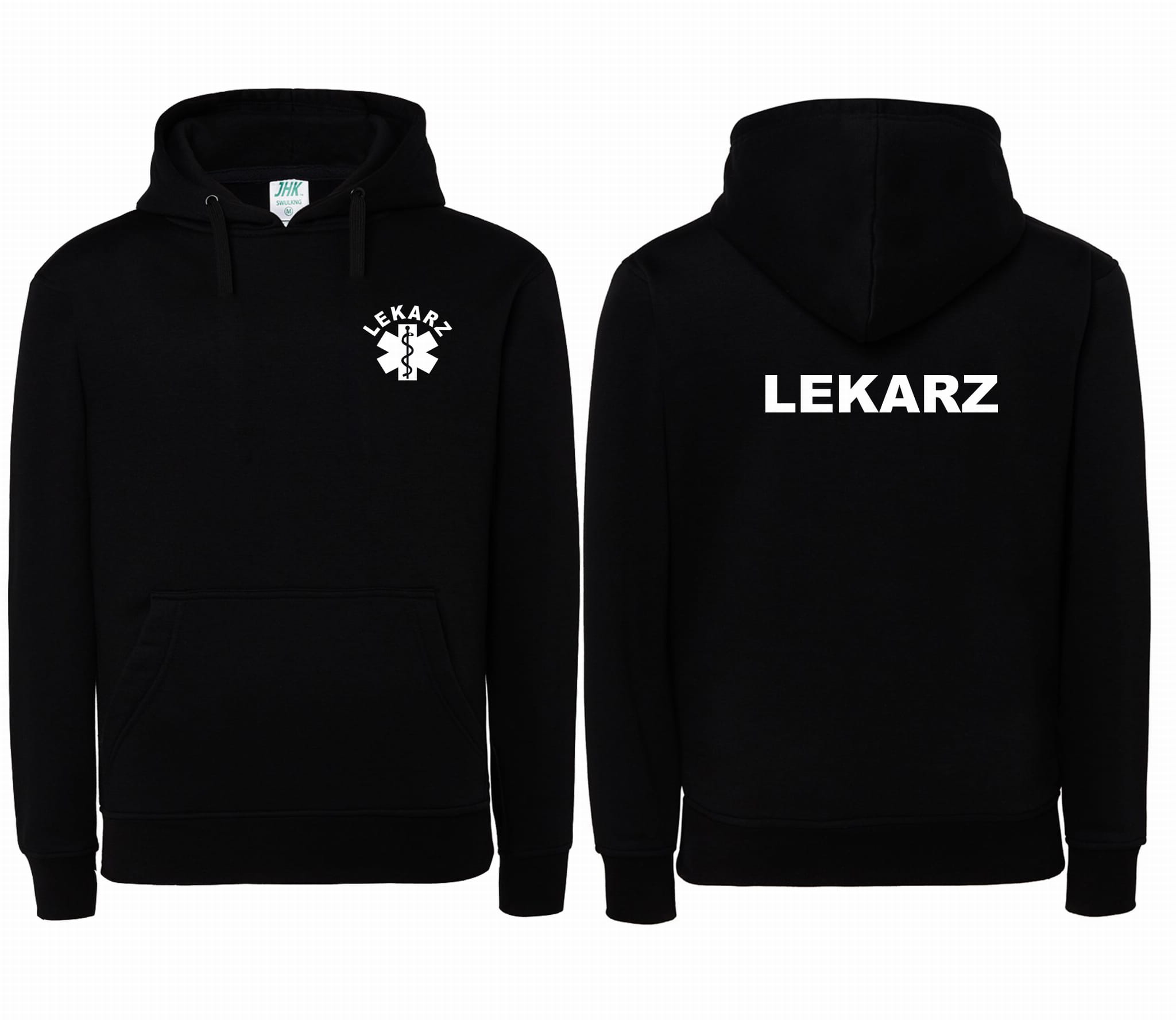 WYPRZEDAŻ 1szt. rozmiar M Bluza damska z kapturem kangurka JHK LEKARZ nadruk PRZÓD i TYŁ - CZARNA