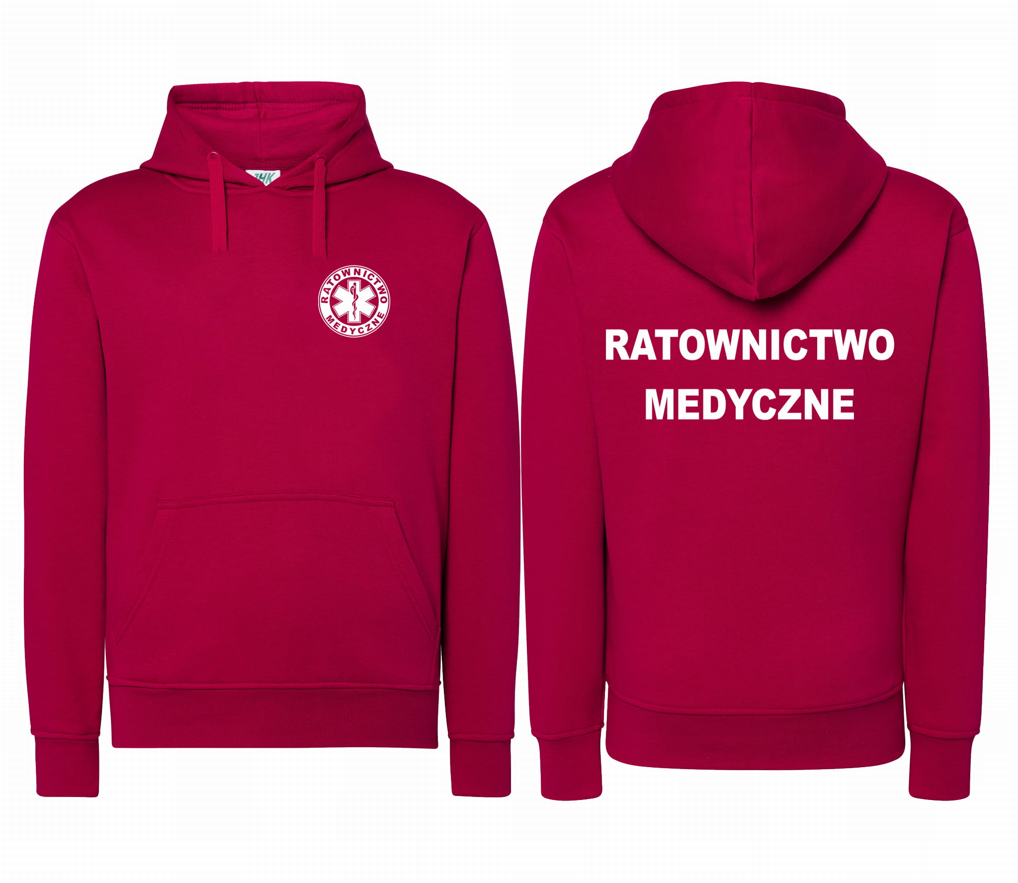 WYPRZEDAŻ 1szt. rozmiar S Bluza damska z kapturem kangurka JHK RATOWNICTWO MEDYCZNE nadruk PRZÓD i TYŁ - MALINOWA