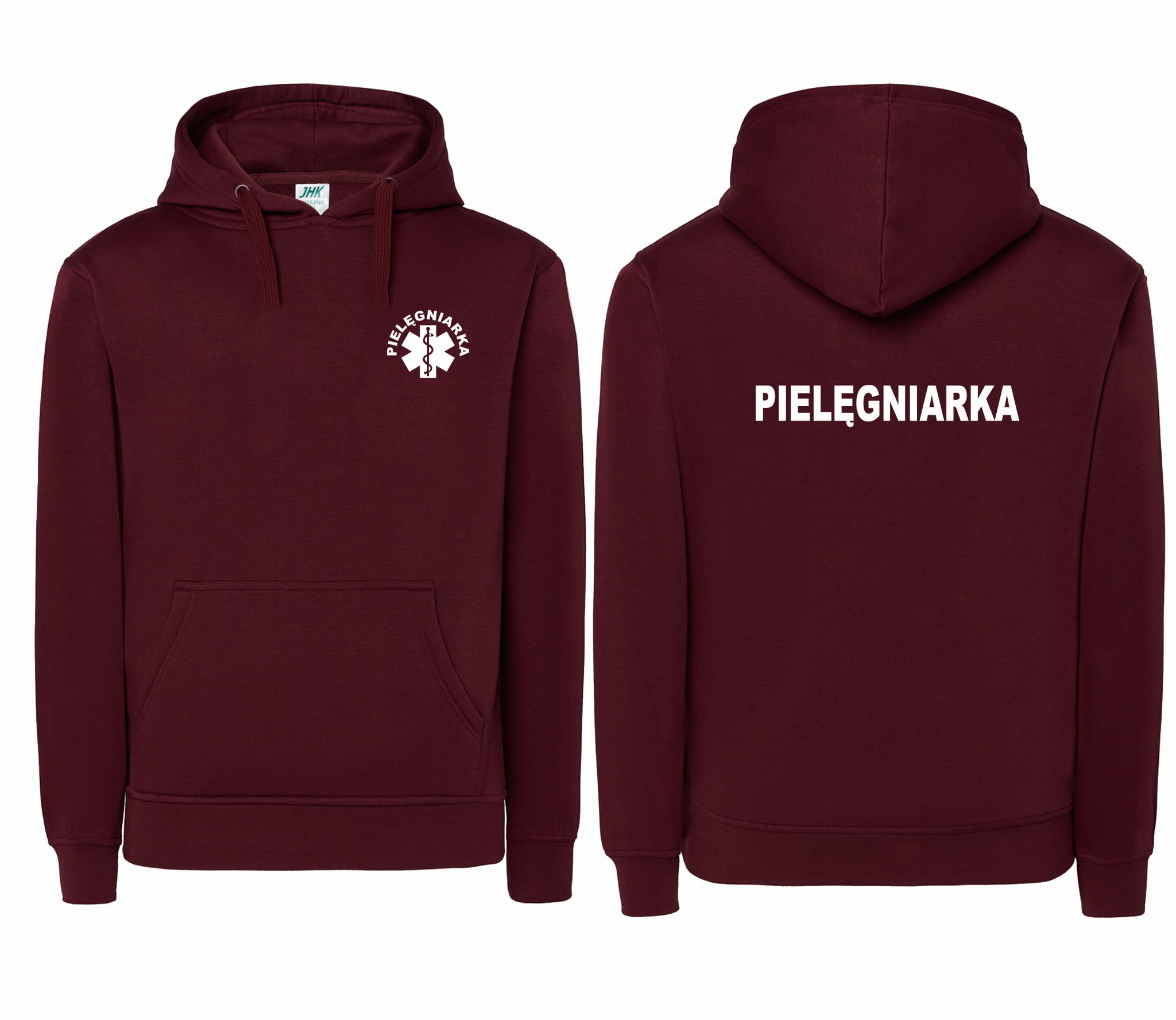 WYPRZEDAŻ 1szt. rozmiar XL Bluza damska z kapturem kangurka JHK PIELĘGNIARKA ESKULAP nadruk PRZÓD i TYŁ- BURGUND